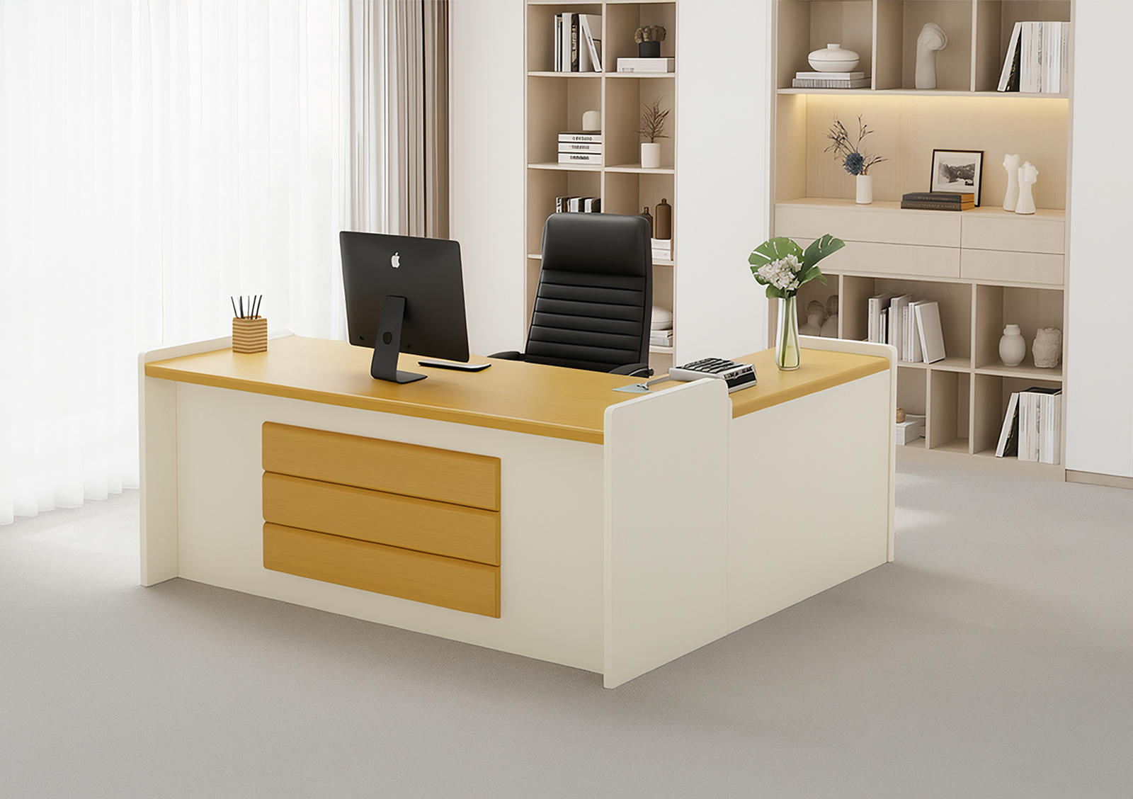 Refined for modern leadership, the Desire features a spacious work surface and a matching integrated side unit, delivering a workspace built for high-level performance and professional organization.