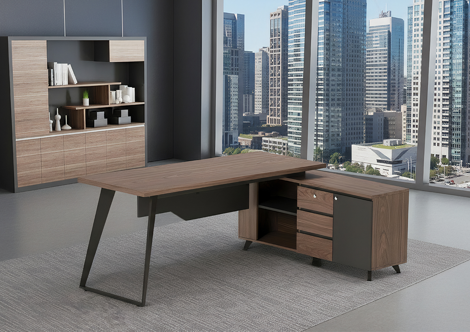 The graphite grey legs are designed with a sharp, angular profile to create a bold and authoritative executive presence.