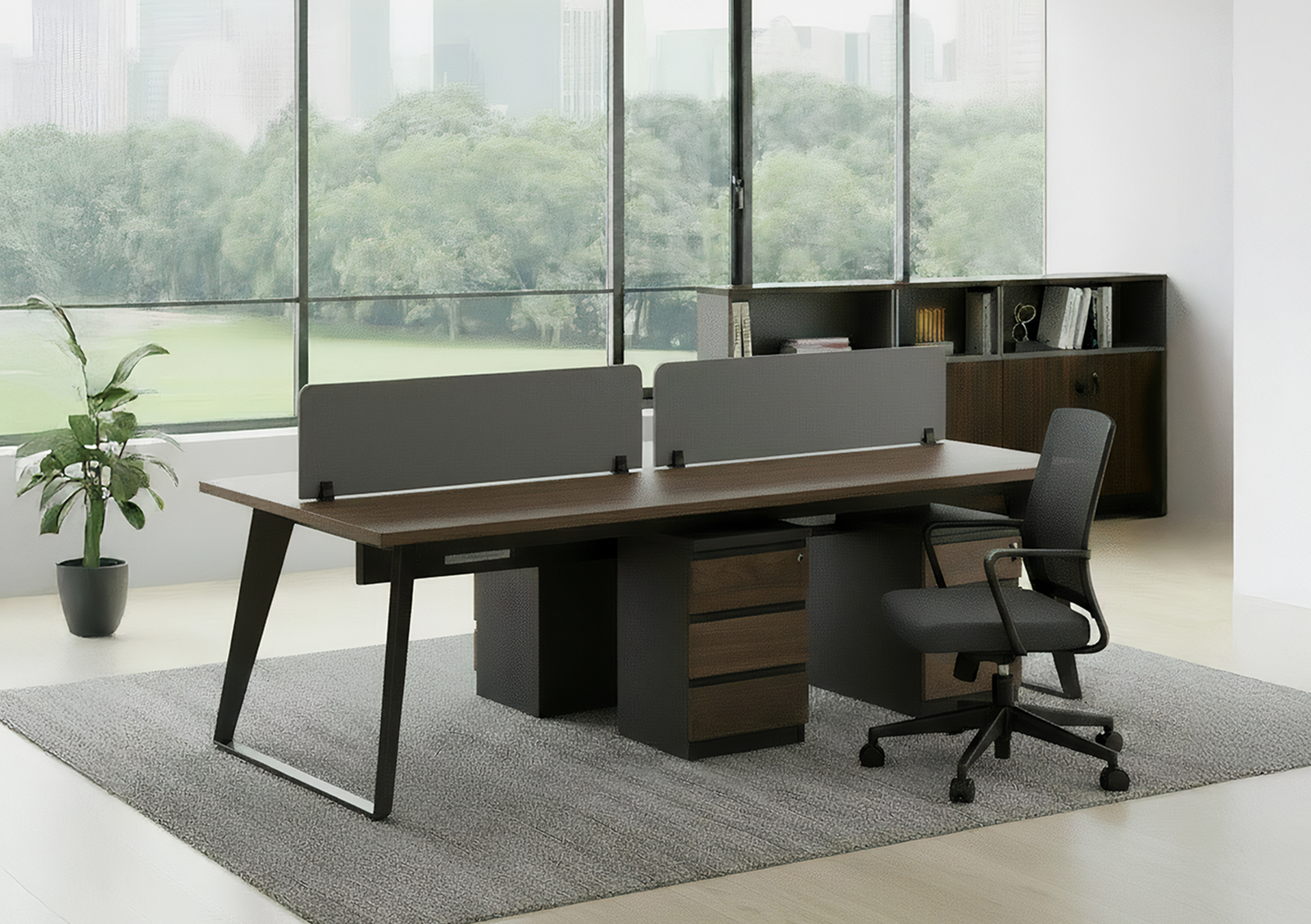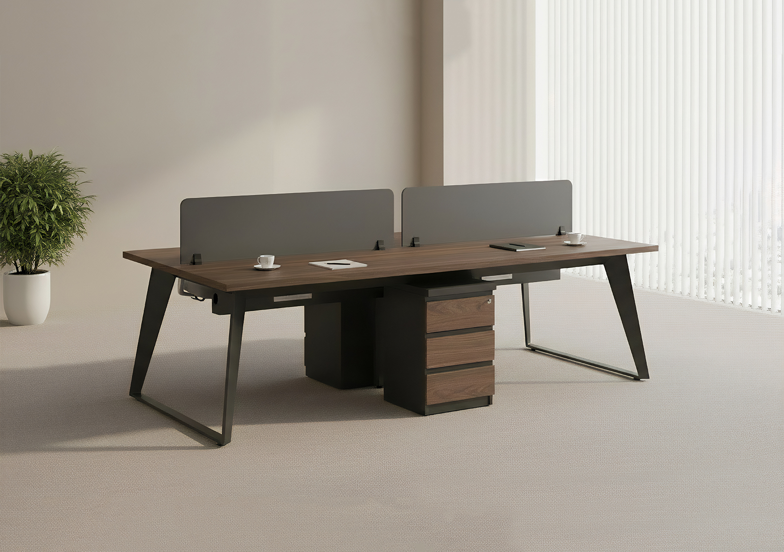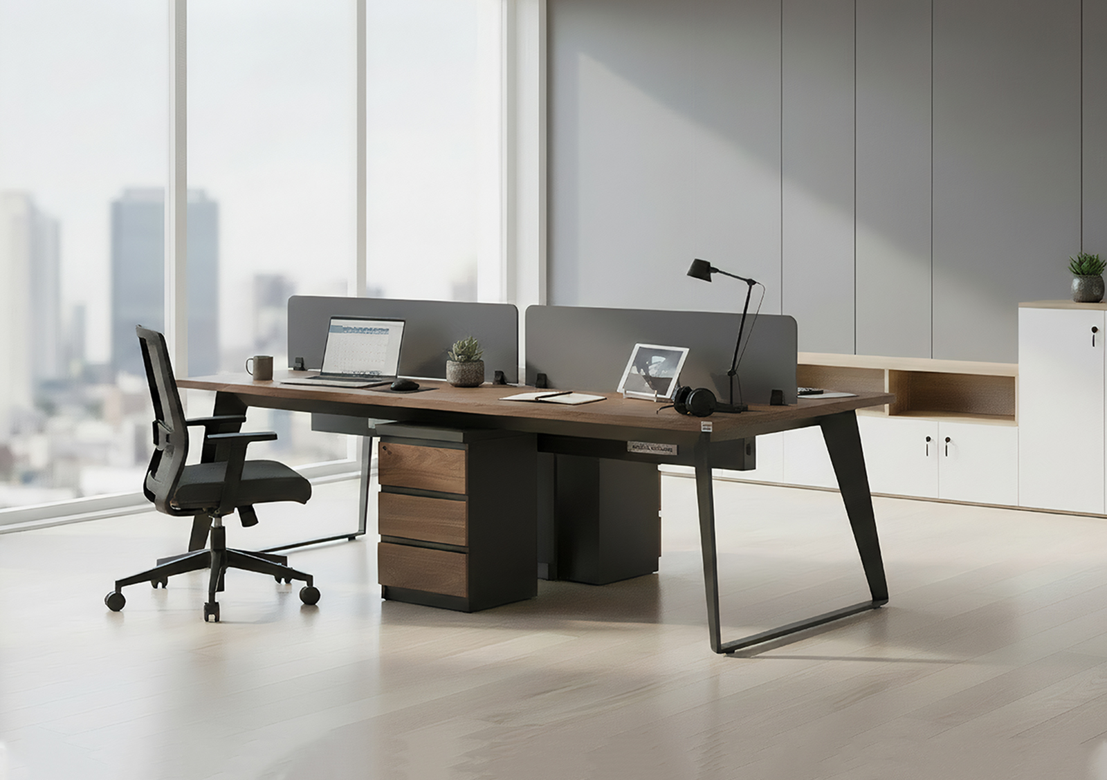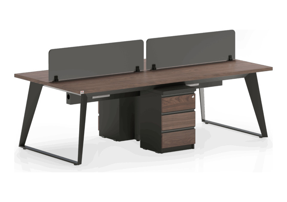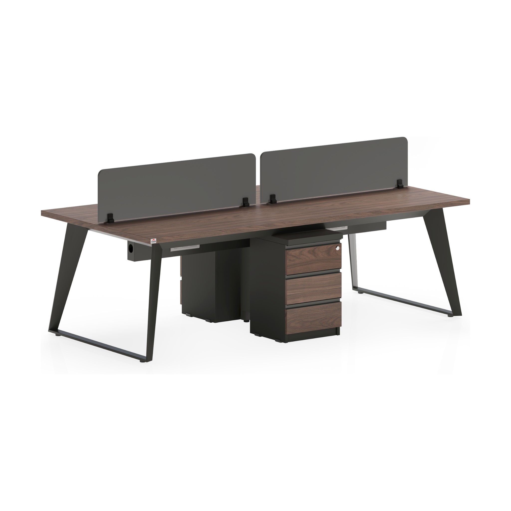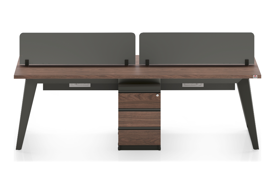 Contemporary workstation featuring sleek slanted legs, rich wood finishes, and frosted glass dividers—designed to blend elegance, functionality, and privacy in a collaborative workspace.
