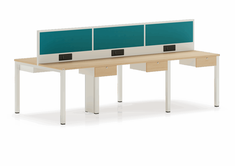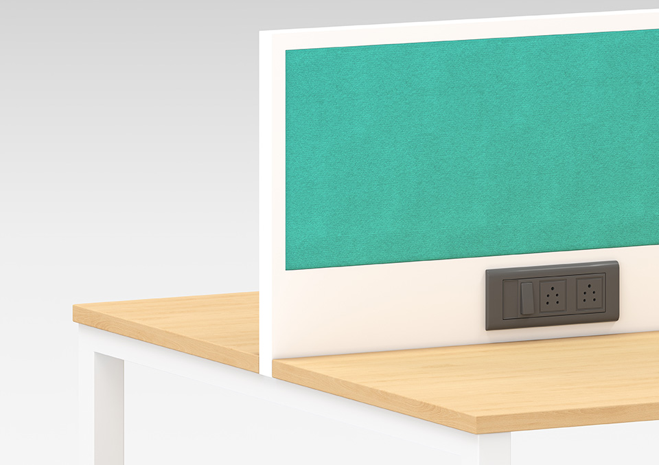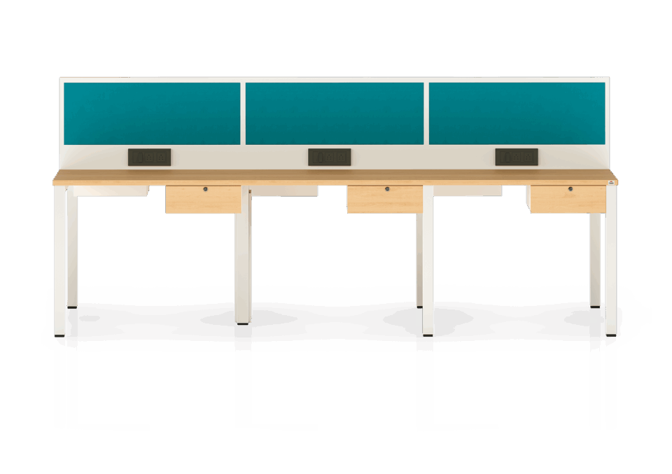 Modular and well-defined, the workstation combines square edges, ample surface space, and vibrant panels for a modern office look.
