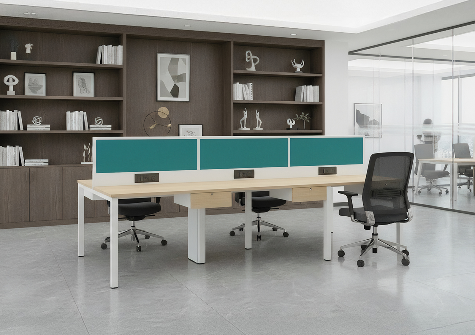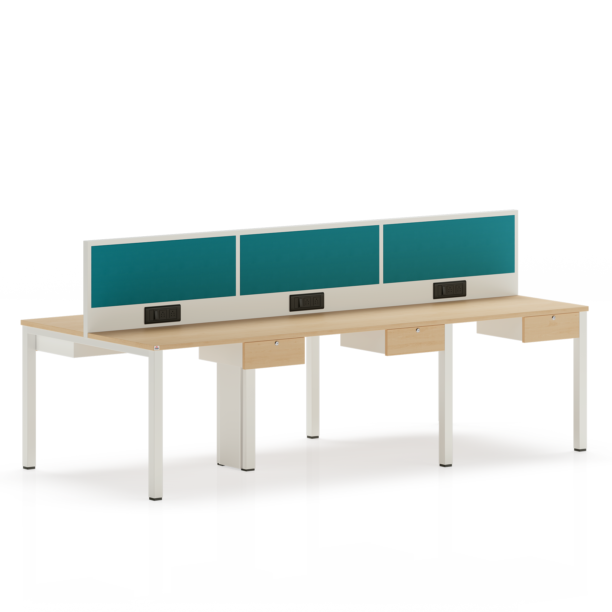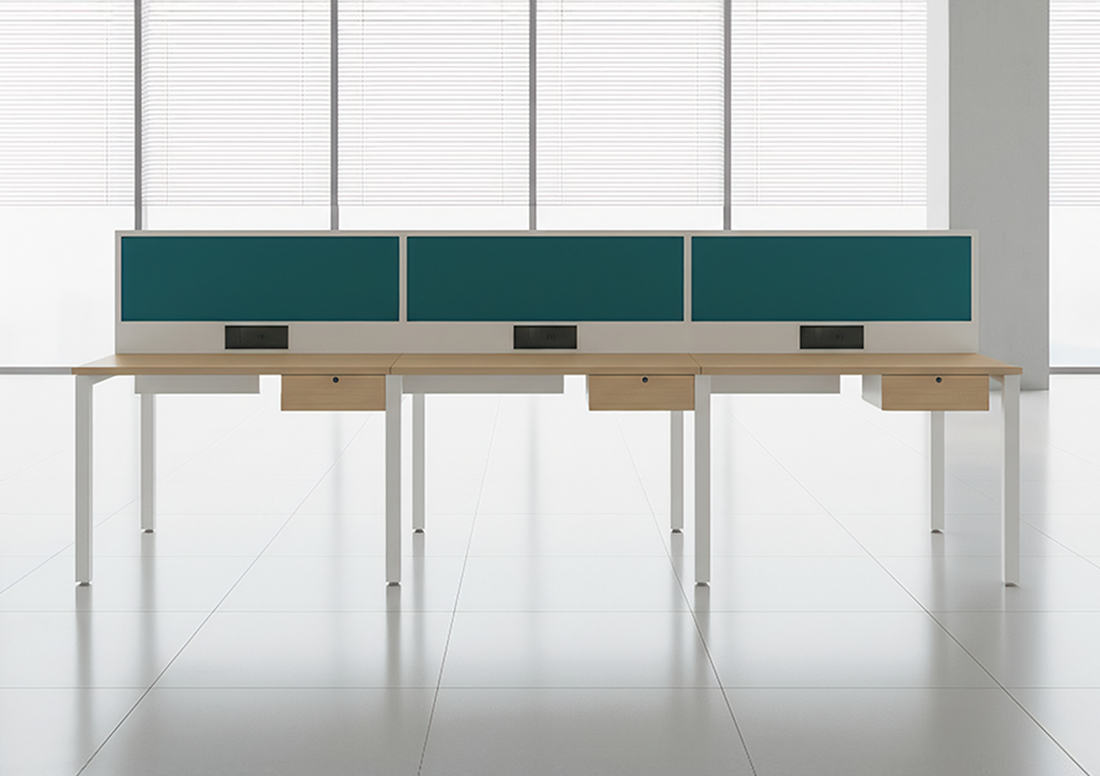 Modular and well-defined, the workstation combines square edges, ample surface space, and vibrant panels for a modern office look.