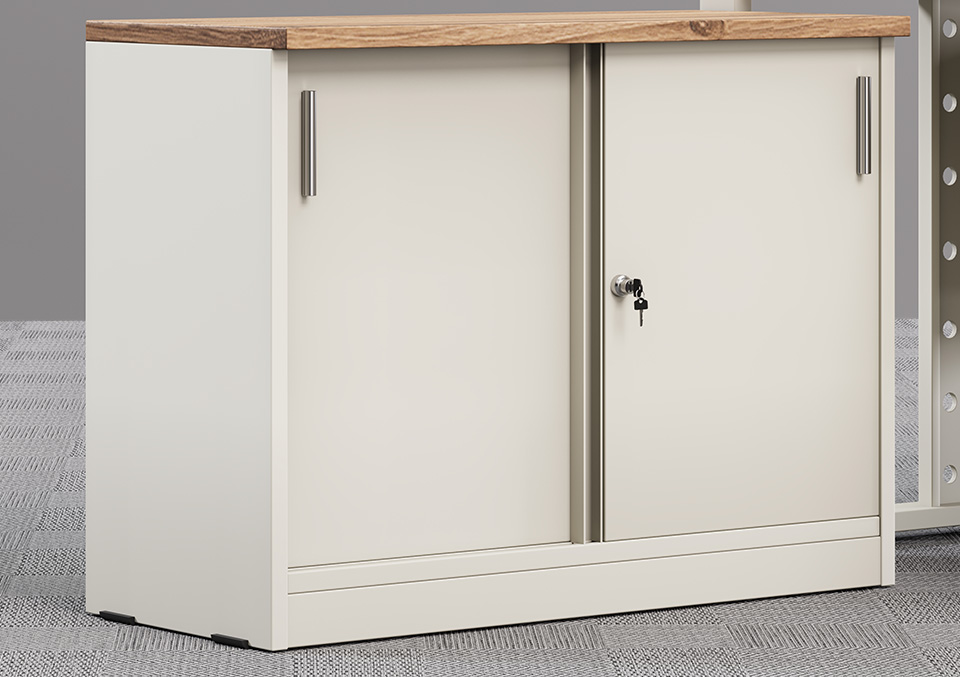 Shows the desk’s front structure with a square top edge and dual-tone finish. The combination of wood grain and dark panel provides a sturdy yet elegant visual profile.